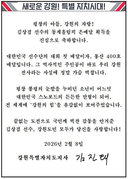 [중앙뉴스라인, 우제헌기자] 김진태 도지사는 8일 2026 밀라노-코르티나담페초 동계올림픽대회에서 강원특별자치도(하이원 스포츠단) 소속 김상겸 선수의 남자 스노보드 평행대회전 은메달 획득을 축하하며, 축전을 보냈다.