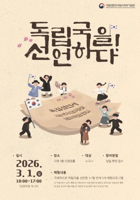 [중앙뉴스라인, 우제헌기자] 국가보훈부는 제107주년 3·1절을 맞아 3·1운동에서 독립선언 과정을 체험할 수 있는 체험프로그램과 문화행사가 국립대한민국임시정부기념관(서울 서대문구)에서 다채롭게 펼쳐진다고 밝혔다.