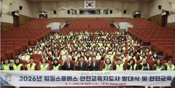 [중앙뉴스라인, 우제헌기자] 부천시는 지난 26일 시청 어울마당에서 ‘2026년 어린이통학안전사업(워킹스쿨버스) 발대식 및 안전교육’을 열고 본격적인 사업 추진에 들어갔다. 이날 행사에는 부천시장을 비롯해 안전교육지도사 117명이 참석했으며, 발대식과 직무교육을 통해 어린이 통학 안전 강화 의지를 공유했다.