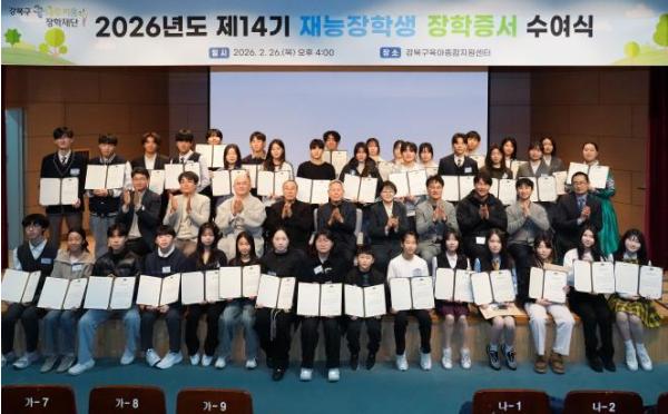 [중앙뉴스라인, 우제헌기자] 서울 강북구는 지난 2월 26일 강북구육아종합지원센터 공연장에서 강북구 꿈나무키움 장학재단 제14기 재능장학증서 수여식을 개최했다고 밝혔다.