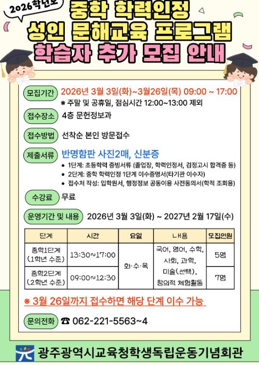 회관은 더 많은 시민에게 기회를 제공하기 위해 중학 학력인정 성인 문해교육 수강생을 추가로 모집한다.
