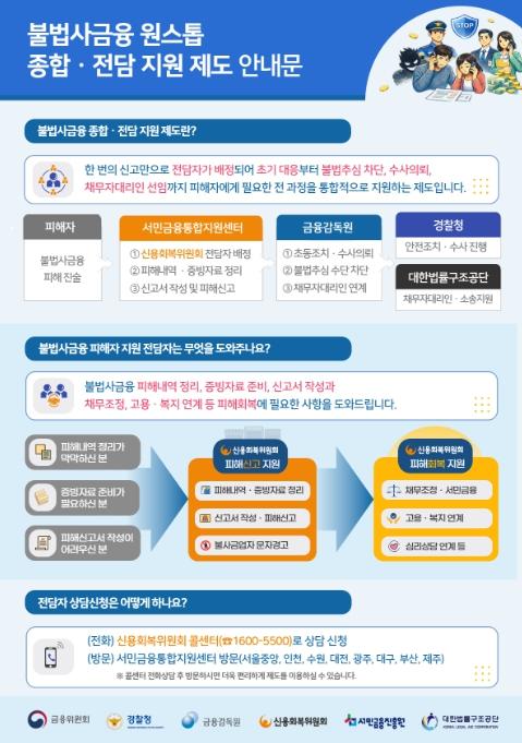 이에, 정부는 8개 권역의 서민금융통합지원센터에 신복위 불법사금융 전담자(17명)를 배치하여, 불법사금융 피해자가 안전하고 편리하게 종합적인 지원을 받도록 조력하는 업무만을 수행토록 했다. 전담자는 피해내역 확인 및 피해신고 절차 제반 지원부터 불법사금융업자에게 즉시 추심 중단 경고, 피해구제·지원 절차 진행상황 확인, 사회 복귀를 위한 채무조정, 고용·복지 지원 연계까지 피해자가 이용가능한 모든 정부·유관기관 서비스를 원스톱으로 지원하게 된다.