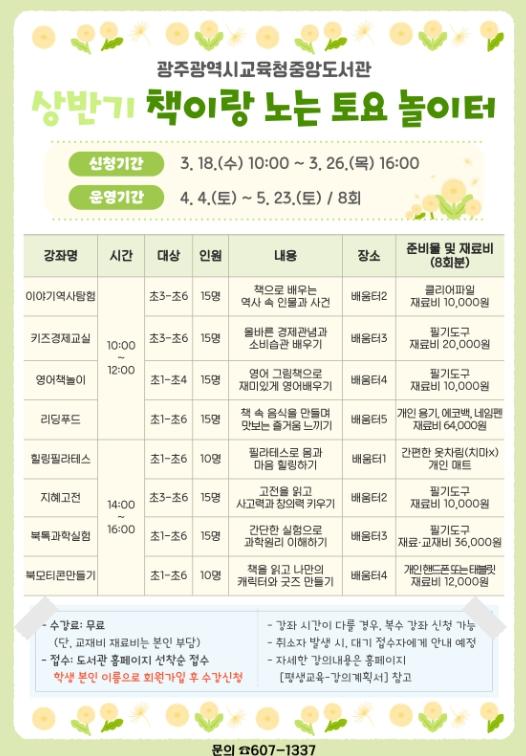 [중앙뉴스라인, 전은희기자] 광주광역시교육청중앙도서관은 오는 4월 4일부터 5월 23일까지 초등학생을 대상으로 ‘2026년도 상반기 책이랑 노는 토요 놀이터’ 프로그램을 운영한다.