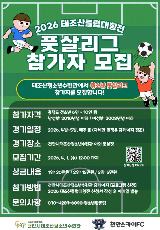 [중앙뉴스라인, 우제헌기자] 천안시청소년재단 산하 천안시태조산청소년수련관은 청소년의 건강한 여가 활동과 스포츠 참여 기회를 확대하기 위해 ‘2026 태조산 클럽대항전 풋살리그’ 참가팀을 모집한다고 20일 밝혔다.