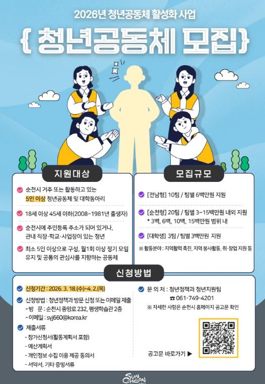 지원 대상은 순천시에 거주하거나 관내 직장·학교·사업장에서 활동하는 18세~45세 청년들로 구성된 5인 이상 공동체이며, 올해는 대학생 동아리까지 대상을 확대해 청년층의 참여 폭을 한층 넓힐 계획이다.