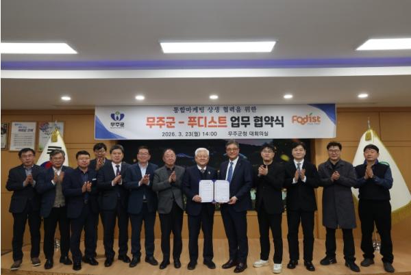 [중앙뉴스라인, 김용범기자] 무주군은 지난 23일 푸디스트(주)와 농산물 통합마케팅 상생협력을 위한 업무협약을 체결했다고 밝혔다. 이날 협약식에는 황인홍 무주군수와 박성하 푸디스트(주) FSBU장을 비롯한 농협 관계자 20여 명이 참석해 의미를 더했다.