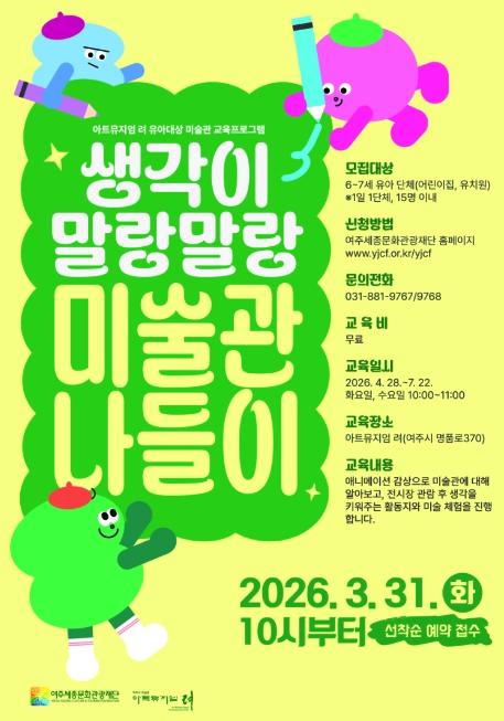 이순열 여주세종문화관광재단 이사장은 “여주의 자라나는 희망인 어린이들이 미술관을 방문하며 미술관을 친숙한 공간으로 인식하고 문화예술을 자연스럽게 체득하길 바란다.”며 “미술관 아트뮤지엄 려가 미래의 예술인을 양성하는 기반이 되기를 기대한다.”고 전했다.