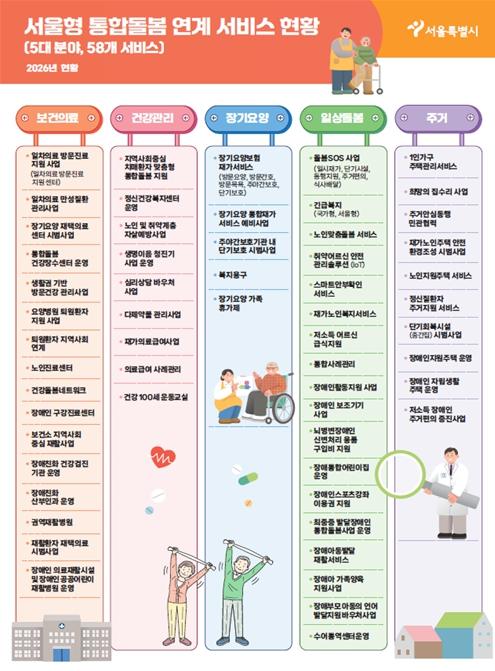 서울시는 어르신, 장애인이 병원이나 시설에 입소하지 않고 살던 곳에서 의료·건강·요양·돌봄·주거 서비스를 통합적으로 맞춤 제공하는 ‘서울형 통합돌봄 서비스’를 본격 시행한다고 밝혔다. 시는 시민 궁금증을 해결해 주고 제도 조기 정착을 돕기 위해 통합돌봄 종합상황실(돌봄복지과) 및 콜센터를 운영한다.