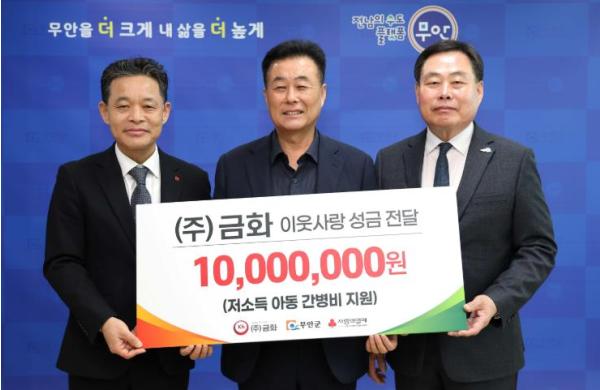 이번 기탁은 무안군 청계면에 위치한 ㈜금화가 질병 치료와 지속적인 관리가 필요한 전문가정위탁(드림스타트) 아동의 간병비 부담을 덜고 안정적인 보호 환경을 지원하기 위해 마련됐다.