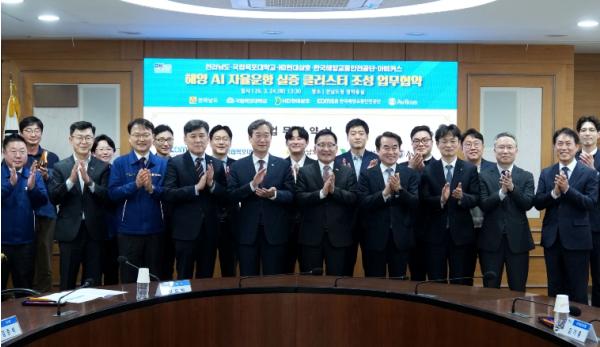 [중앙뉴스라인, 전은희기자] 전라남도는 선박 운항 안전관리와 예방체계 구축을 위해 24일 도청에서 국립목포대학교, HD현대삼호, 한국해양교통안전공단(KOMSA), 아비커스와 함께 해양 인공지능(AI) 자율운항 실증 클러스터 조성 업무협약을 했다.