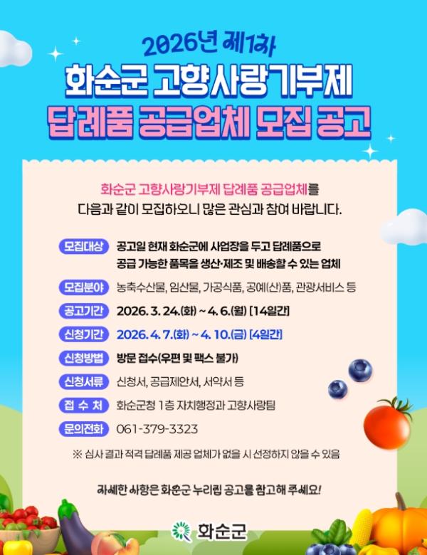 모집 대상은 화순군에 사업장을 두고 답례품 공급이 가능한 품목을 안정적으로 생산·제조·배송할 수 있는 업체이다. 다만 금융기관 불량거래처 규제 업체, 지방세 및 국세 체납 업체, 휴·폐업 중인 업체 등은 신청이 제한된다.