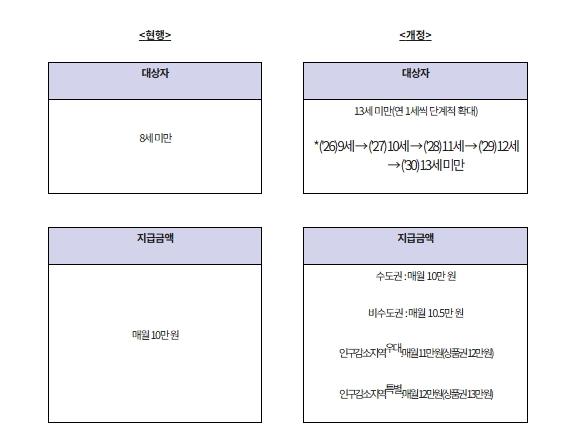 아동수당은 8세 미만의 아동에게 매월 10만 원씩 지급 중이나, '아동수당법' 개정을 통해 지급 연령을 13세 미만 아동까지 매년 1세씩 단계적으로 상향하고, 비수도권 및 인구감소지역에 거주하는 아동은 대통령령으로 정하는 바에 따라 매월 2만 원 범위에서 추가로 지급한다. 또한 인구감소지역에서 아동수당을 지역사랑상품권으로 지급하는 경우 매월 1만 원 상당액을 추가로 지급한다.