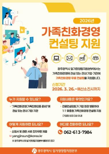 지원 대상은 광주지역 기업과 기관으로 ▲50인 이하 중소사업장 ▲ 2026년도 가족친화인증 신규, 유효기간 연장, 재인증 신청 기업·기관 ▲전년도 인증 신청 후 탈락 기업·기관 등을 우선 지원한다.