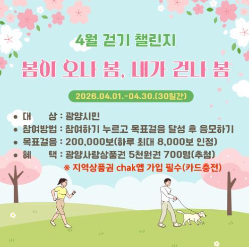 [중앙뉴스라인, 한소연기자] 광양시는 오는 4월 1일부터 4월 30일까지 건강걷기 실천 모바일 걷기앱 워크온을 통해 ‘봄이 오나 봄, 내가 걷나 봄! 4월 걷기 챌린지’를 운영한다고 밝혔다.