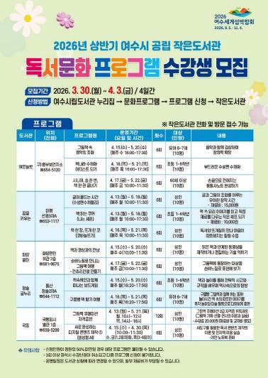 [중앙뉴스라인, 전은희기자] 여수시는 오는 3월 30일부터 4월 3일까지 공립 작은도서관 ‘2026년 상반기 독서문화 프로그램’ 수강생을 모집한다고 밝혔다.
