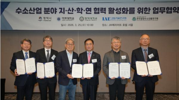 [중앙뉴스라인, 김영환기자] 평택시는 25일, 아주대학교·평택대학교·고등기술연구원·한국청정수소진흥연구원과 '수소산업 분야 지산학연 협력 활성화를 위한 업무협약(MOU)'을 체결했다고 밝혔다.