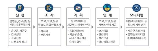 통합돌봄 서비스 신청․접수는 관할 지자체 읍면동 또는 건강보험공단 지사를 방문하거나 우편․팩스를 통해 할 수 있으며, 신청자의 돌봄 필요도 조사와 개인별 지원계획 수립 절차를 거쳐 시군 전담부서에 설치된 통합지원회의를 통해 제공서비스가 최종 확정된다.