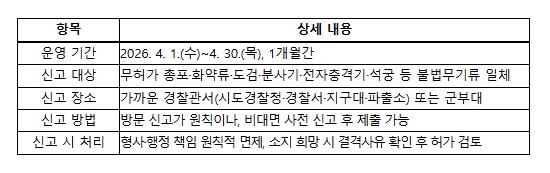 [중앙뉴스라인, 양병남기자] 경찰청은 불법무기류로 인한 범죄와 사고를 미리 방지하기 위하여 국방부 및 행정안전부와 합동으로 4월 1일부터 30일까지 한 달간 '2026년 1차 불법무기류 자진신고 기간'을 운영한다.