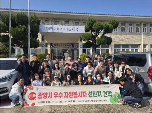 광양시(광양시자원봉사센터)는 지난 25일부터 27일까지 2박 3일 일정으로 제주도 일원에서 ‘2026년 우수 자원봉사자 선진지 견학’을 실시했다고 밝혔다.