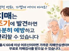 특히 치매 전 단계인 경도인지장애 관리가 치매 유병률을 낮추는 핵심과제인 만큼, 올해 상·하반기(4월, 9월) 연 2회 집중 검진 기간을 운영해 조기 발견과 관리를 강화할 계획이다.