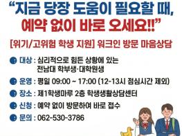 1일 전남대에 따르면, 학생생활상담센터는 심리적 위기를 경험하는 학생들을 신속하게 지원하기 위해 ‘워크인(Walk-in) 심리상담’ 제도를 도입하고 본격 운영에 들어갔다.