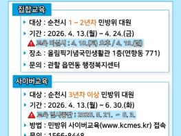 [중앙뉴스라인, 전은희기자] 순천시는 오는 13일부터 관내 민방위 대원의 비상사태 및 재난 발생 시 대응 역량 강화를 위해 ‘2026년 민방위 본교육’을 실시한다고 밝혔다.