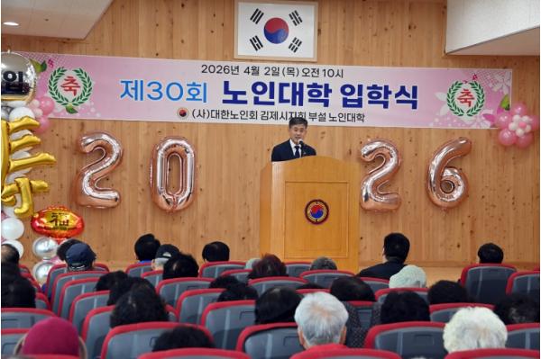 [중앙뉴스라인, 김용범기자] 김제시는 대한노인회 김제시지회가 2일 지회 2층 강당에서 노인대학생 및 관계자 등 약 220명이 참석한 가운데 '2026학년도 제30회 노인대학 입학식'을 개최했다고 밝혔다.