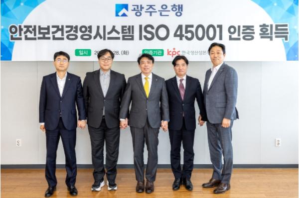 광주은행(은행장 정일선)은 28일 광주은행 본점에서 정일선 광주은행장과 강장진 한국생산성본부인증원장 및 주요 관계자들이 참석한 가운데, 안전보건경영시스템 국제표준인 ‘ISO 45001’ 인증 수여식을 개최했다고 밝혔다.