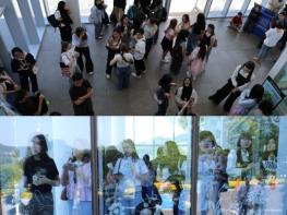 통유리 외벽 전체를 캔버스로 활용한 퍼포먼스에 음악이 더해지며 현장 분위기를 한층 끌어올렸다.
