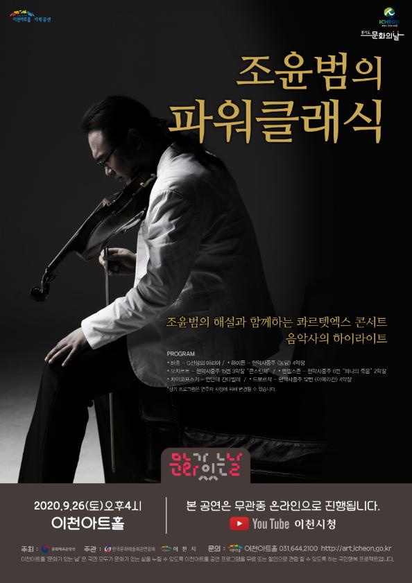 코로나19 사태로 인해 온라인 무관중 공연을 꾸준히 선보이고 있는 이천아트홀에서 오는 9월 26일 언택트(untact)시대에 어울리는 클래식 교육공연 ‘조윤범의 파워클래식’을 이천시청 공식 유튜브 채널(https://www.youtube.com/user/2000ishappy)을 통해 선보인다.