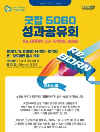 26일 오후 2시부터 온·오프라인으로 동시에 개최된 ‘굿잡5060’ 2021 성과공유회에는 서울시50플러스재단 문혜정 대표이사, 현대차그룹 이병훈 상무, 고용노동부 황보국 통합고용정책국장, 상상우리 신철호 대표 등 주요 관계자들과 프로젝트 수료생 150여 명이 함께 자리했다.