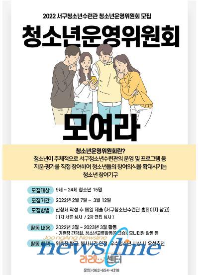[중앙뉴스라인 = 송상교기자] 광주서구청소년수련관 ‘라라센터’는 "오는 3월 12일까지 청소년운영위원회 신규 위원을 모집한다"고 15일 밝혔다.