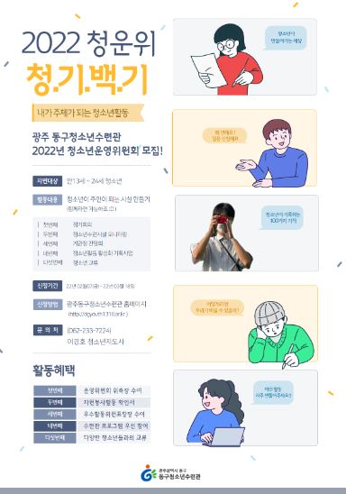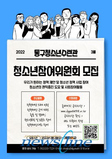 [중앙뉴스라인=송상교기자] 광주광역시 동구청소년수련관은 “관내 거주 및 소재 학교 재학중인 만 13세~24세 청소년을 대상으로 오는 3월 18일까지 청소년운영위원회·청소년참여위원회 위원을 모집한다”고 11일 밝혔다.