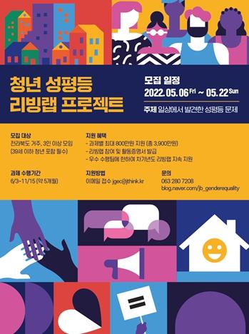 [중앙뉴스라인, 김용범기자] 여성가족부 지정 전북거점형양성평등센터(전북연구원 여성정책연구소)는 5월 6일부터 5월 22일까지 ‘청년 성평등 리빙랩 지원 사업’의 참가 모임을 모집한다.