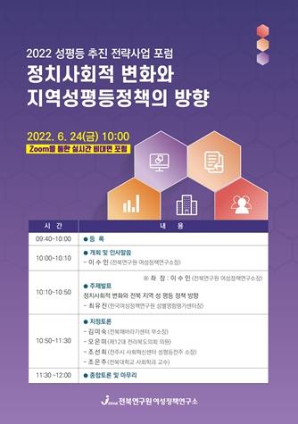 이번 포럼은 새 정부의 여성가족부 폐지 논란 가운데 출범하는 민선8기에서는 지역별 성 평등 여건 격차가 더욱 확대될 것으로 예상됨에 따라 전북의 성 평등 정책현황을 진단하고 포괄적 성평등 정책추진을 위한 방향과 중점과제를 모색하는 자리였다.