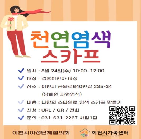 [중앙뉴스라인, 송상교기자] 이천시가족센터는 경기도여성단체협의회 이천시지회와 협력하여 결혼이민자 여성을 대상으로 하는 ‘천연 염색 스카프 만들기’ 힐링 프로그램을 진행한다. 프로그램은 24일 10시부터 오전 시간 동안 진행되며 이천시 율면 석산리 부래미 마을에 위치한 ‘남혜인 자연염색 피어랑’에서 진행될 계획이다.