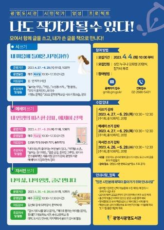 '시민 작가 양성 프로젝트'는 총 세 가지 글쓰기 장르 시·에세이·자서전 등 각 분야에서 현재 활발히 활동 중인 전문 강사의 지도하에 운영되는 글쓰기 프로그램으로, 모든 강좌는 강사의 코칭을 통해 글쓰기의 기본기를 읽히며 자신이 쓴 글을 직접 첨삭을 받고, 교육 완료 후 참여자들의 창작 글을 엮어 하반기 문집으로 제작될 예정이다.