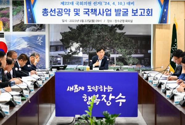 장수군에 따르면, 22일 군청 회의실에서 최훈식 군수 주재로 부서장 등 40여 명이 참석한 가운데 제22대 총선공약 및 국책사업 발굴 보고회를 가졌다.