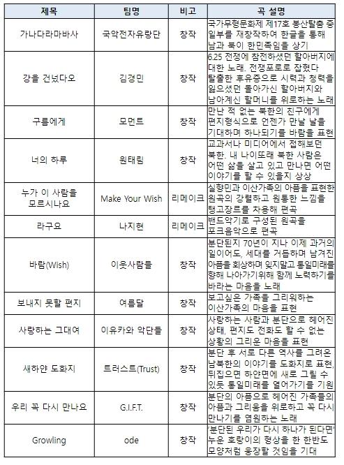 국민의견 수렴 결과를 토대로 사전 저작권 협의를 통해 그날에(이승철), 누가 이사람을 모르시나요(패티김), 라구요(강산에), 실향민의 한(설운도), 평화의 바람(소향, 박완규) 5곡의 과제곡을 선정했다.