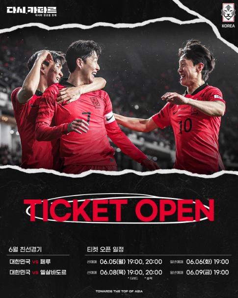 [중앙뉴스라인, 차행운기자] 대한축구협회는 페루와 엘살바도르를 상대로 치르는 '하나은행 초청 축구국가대표팀 친선경기' 입장권을 5일부터 차례로 판매한다고 밝혔다. 클린스만 감독이 이끄는 축구대표팀은 오는 16일 부산아시아드주경기장에서 페루와, 20일 대전월드컵경기장에서 엘살바도르와 맞붙는다. 두 경기 모두 저녁 8시에 킥오프된다.