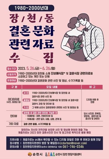 시는 1980년에서 2000년대 장천동 소재 진보예식장(장천동 15-3)을 비롯해 옛 순천의 결혼식장과 관련된 사진과 영상 자료를 모집하며, 해당 자료의 저작권을 보유한 개인 및 단체 등 누구든지 참여가 가능하다.