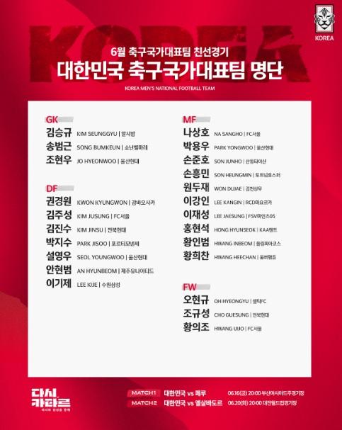 대한축구협회(KFA)는 6월 A매치 2연전을 앞두고 23명의 소집명단을 5일 발표했다. 3월에는 26명을 뽑았는데 이번에는 23명을 선발해 명단에 추가되는 선수가 나올 수 있다. 또한 중국에 형사 구류 중인 손준호(산둥 타이샨, 중국)도 상황에 따라 대체 선수를 뽑아야 할 수 있어 명단은 유동적이다.