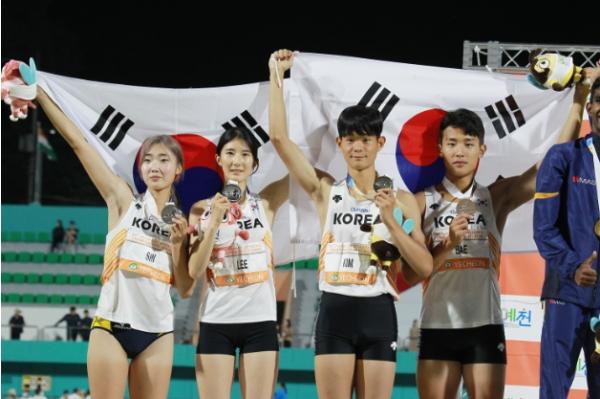 혼합 4X400m 계주에서 3위로 달리던 대한민국은 400m 은메달리스트인 배건율 선수가 단숨에 2위로 순위를 역전시켜 김정현?이민경?신현진 등4명의 선수들이 멋진 호흡으로 값진 은메달을 수확했다.