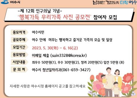 [중앙뉴스라인, 조성열기자] 여수시가 제12회 인구의 날을 기념해 ‘행복가득 우리 가족’ 사진 공모전을 개최한다.