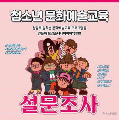이번 수요조사(온라인 설문조사)는 청소년들이 진정으로 원하는 문화예술 프로그램을 청소년들 스스로가 직접 제안하고 이를 교육 과정에 반영하고자 마련됐다.