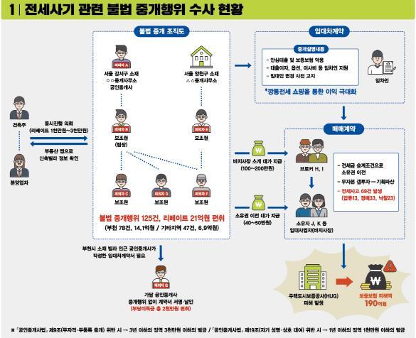 [중앙뉴스라인, 백흥순기자] 전세와 매매를 ‘동시 진행’하는 전세 사기 매물로 깡통전세 계약을 유도한 부동산 중개업자 7명이 경기도 공정특별사법경찰단에 적발됐다. 이번 전세 사기는 중개업자와 함께 임차인, 바지 사장(임대사업자) 등이 보증보험 가입 시 전세 금액과 상관없이 전액을 보증해 주는 제도를 악용한 새로운 유형으로, 이들로 인한 보증보험 피해액만 무려 190억 원에 달한다.