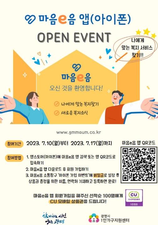 오픈 이벤트에 참여하고자 하는 아이폰 이용자는 17일 18시까지 마음e음 앱을 내려받고 회원가입 후 인증을 완료하면 되며, 선착순으로 100명에게 기프트콘 모바일 상품권이 지급될 예정이다.