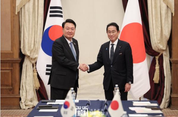 [중앙뉴스라인, 우제헌기자] NATO 정상회의 참석차 리투아니아를 방문 중인 윤석열 대통령은 현지시간 7월 12일 13:05-13:35 약 30분 간 기시다 후미오(岸田文雄) 일본 총리와 한일 정상회담을 가졌다.