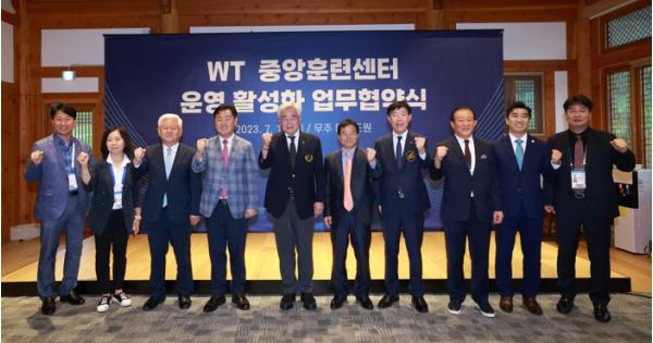 전라북도는 15일 무주 태권도원에서 김관영 도지사, 조정원 세계태권도연맹 총재, 양진방 대한태권도협회장, 황인홍 무주군수가 참석한 가운데 세계태권도연맹이 지정한 중앙훈련센터* 운영 활성화를 위한 업무협약을 체결했다고 밝혔다.