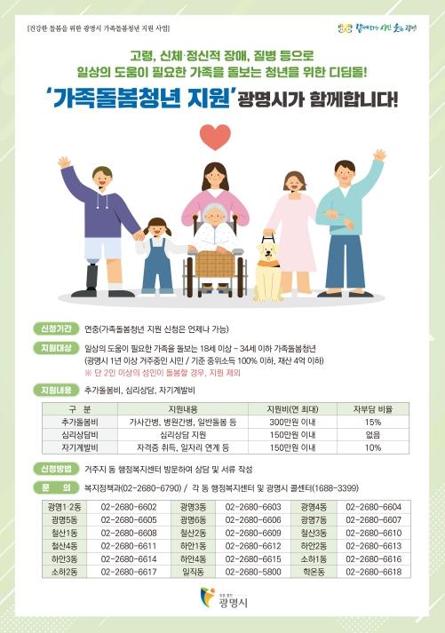 대상은 고령·장애·질병 등으로 돌봄이 필요한 가족과 주소(광명시)를 같이하는 18세 이상 34세 이하의 가족돌봄청년으로 그중 중위소득 100% 이하, 재산 4억 원 이하의 가구로 심의를 통해 대상자를 선정한다.